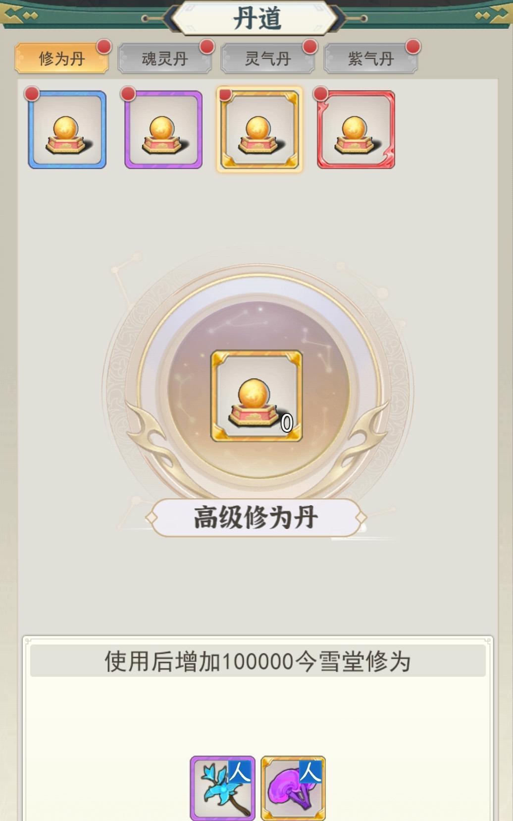 然后就是有关洞府炼丹的,洞府里的炼丹炉升级可以解锁更高级的丹药,人界最高解锁3级丹药,所以存着炼3级丹药经验最多。