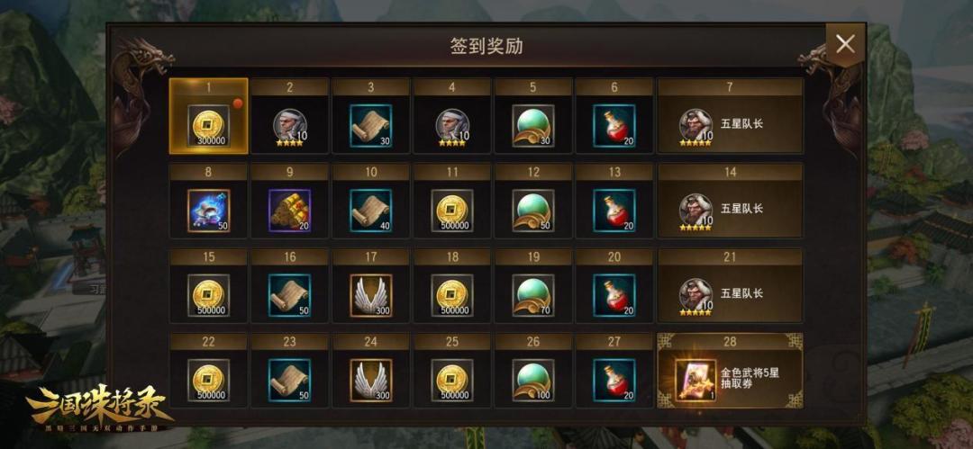 完成每日签到,主公即可获得金币、万夫长、扫荡券、五星队长等诸多好礼!另外,只要您登录游戏完成新主公欢迎庆典系列任务,还可以获得强力武将马超!不管是养成资源还是勇猛武将,都将为您的三国战场添上浓墨重彩的一笔!
