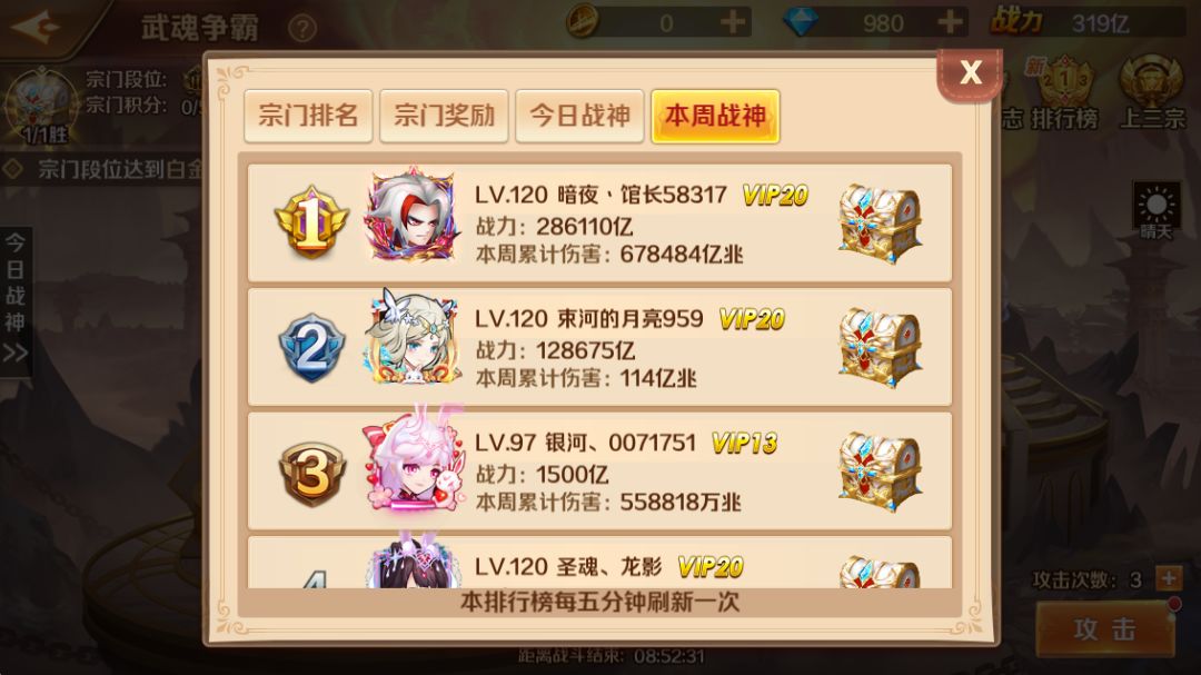 (2)本周战神:新增本周战神排行榜,魂师大人们可以通过武魂争霸玩法内的排行榜功能查看。本周战神将记录玩家一周内的总伤害值进行排名,排名前10的玩家将给宗门所有成员带来钻石福利奖励。