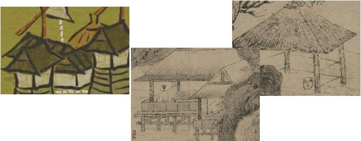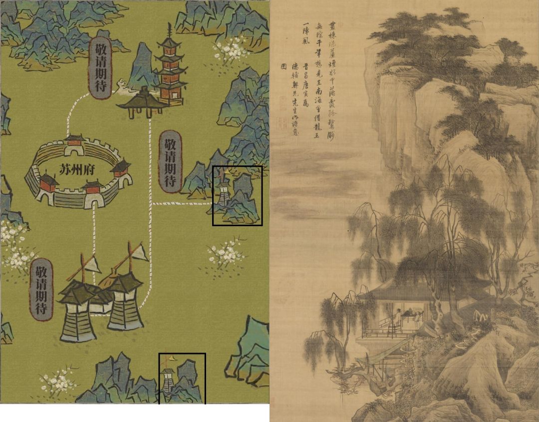 之前我设想该处应是桃花坞,但依宋末元初徐大焯《烬余录》中描述:“入阊门河而东,循能仁寺、章家河而北,过石塘桥出齐门,古皆称桃花河。河西北,皆桃坞地,广袤所至,赅大云乡全境。”可知桃花坞应在苏州府北。但欣赏唐寅《幽人燕坐图》时我发现了有趣的东西,如图,看这水阁构图和草亭顶,当然这大概率是巧合,作为证据太牵强附会了。