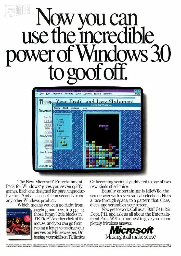 刚发售时的Windows 3.0,就内置了经典的《纸牌》游戏和黑白棋。同年的10月8日,微软发布了拓展性质的Windows娱乐包(WEP),广告标语如下:
