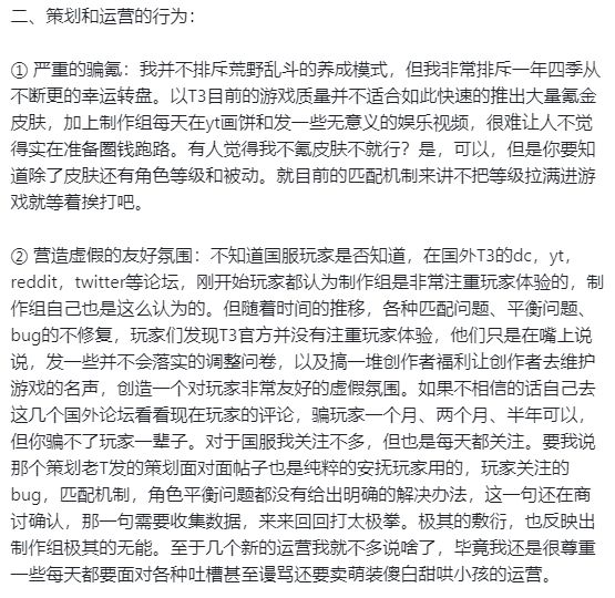 说到这里,就截取选手@小日光TShine 在评价中提及的一些问题,为大家做一下回答。首先感谢这位选手,爱之深责之切的道理我们也是明白的,正面在专栏里进行回复也算是对您评论中“不注重玩家的体验,只是在嘴上说一说”的回应;一些上面提过和外服的问题先略过,后续像新英雄、新地图和高质量活动我们也会加快进度,本篇老T着重回答一下您提到的骗氪和论坛规划方面。