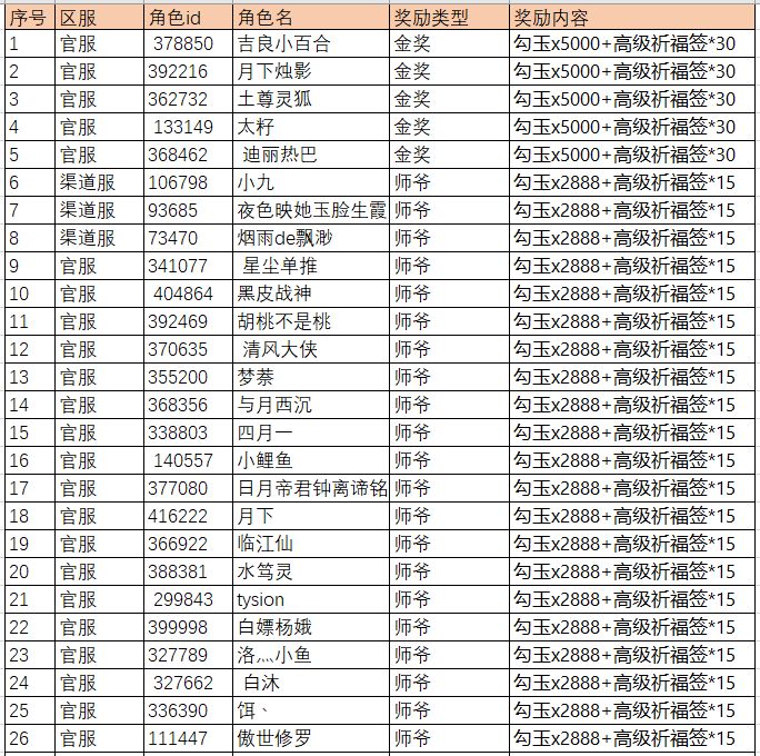 无双攻略干饭奖(未获金奖和军师奖的所有符合要求的干饭人):(勾玉x1888+高级祈福签*8)