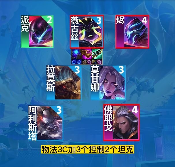 新版本的薇古丝变成了强力的后排输出,搭配至高天羁绊,还能召唤出前排扎克,本阵容有前排坦克有后排输出,是上分必备阵容哦~