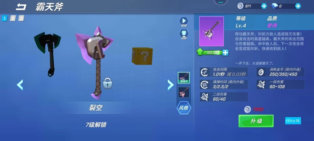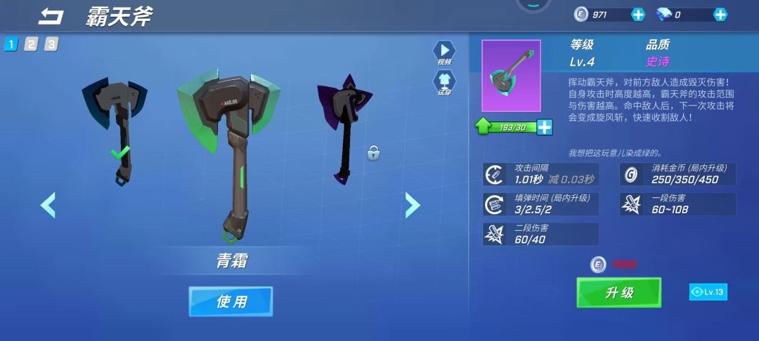 消耗金币:250/350/450(局内升级)填弹时间:3/2.5/2介绍:【霸天斧】这个道具的使用时,可以对攻击范围前方敌人造成毁灭伤害,自身攻击高度越高,霸天斧的攻击范围和伤害越高。