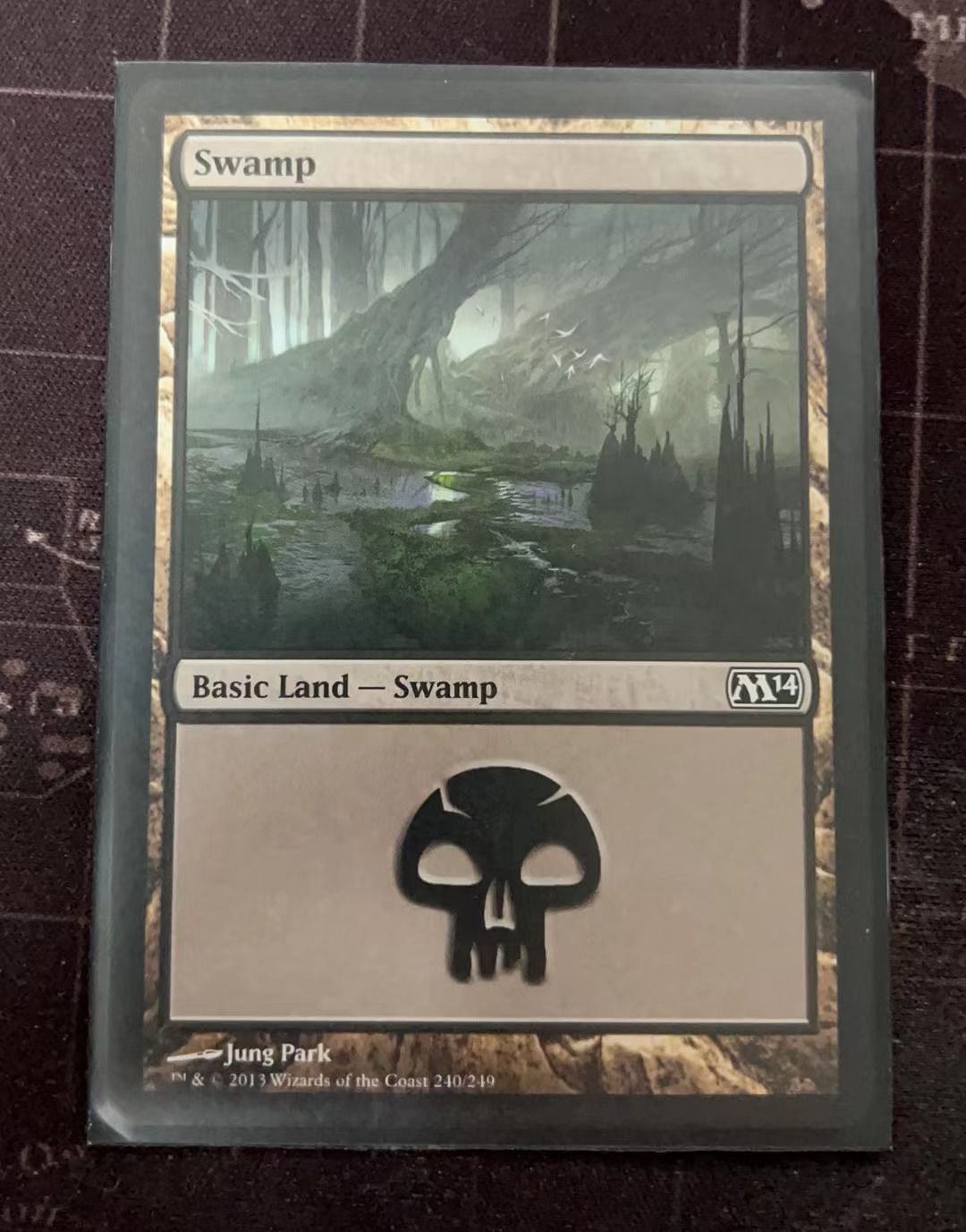 (下面是一张“地”牌,沼泽,提供1点黑色法术力,是游戏中的资源系统,每回合可打出1张,实拍有牌套)