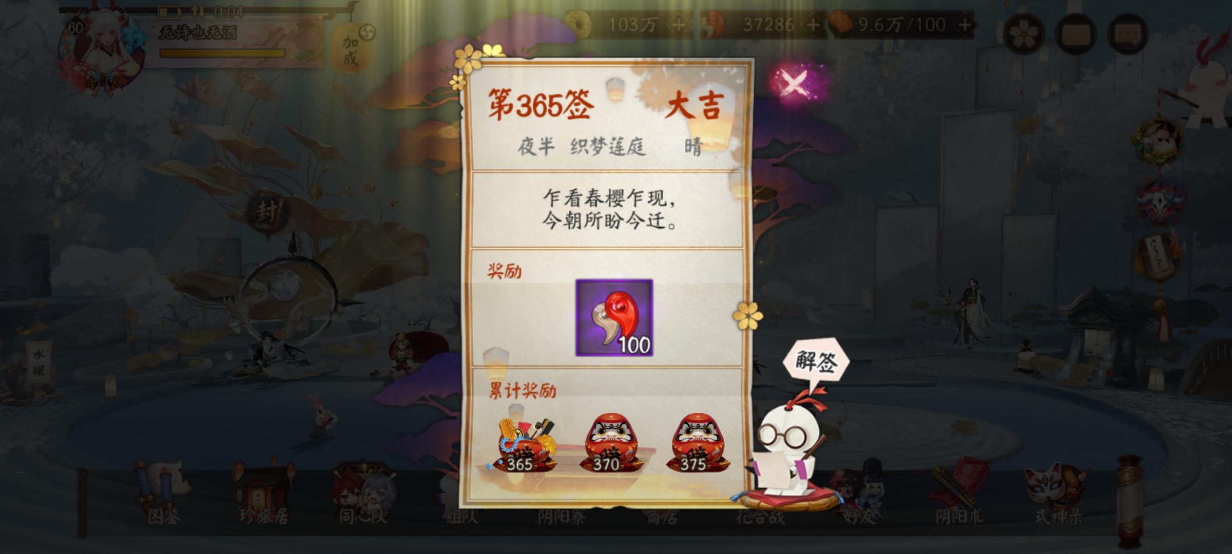 不知不觉一周年啦,拿到了梦寐以求的小晴明皮肤,但是随机ssr又戳心了,咸鱼小公主,从过年开始,我就再没有抽到ssr未收录了。为了假全,我连续拼了3个ssr,现在在拼第4第5个,非的让人不敢置信。这游戏也慢慢的有点厌倦了。式神加技能从来都是555,抽卡不出未收录,emmm,大概是在防沉迷?