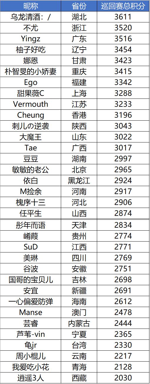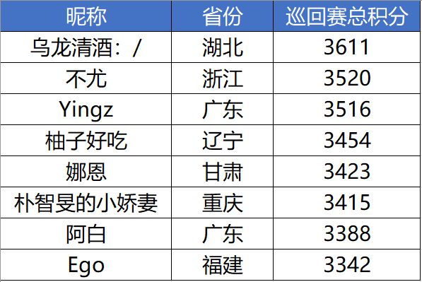 紧接其后的是来自浙江的“不尤”和来自广东的“Yingz”,目前积分分别为3520和3516。众所周知,浙江与广东是竞争最为激烈的两省,每到赛程的后半段都会出现分数暴走,排名一飞冲天的玩家,所以排名较为靠前的各位,一定不能掉以轻心!