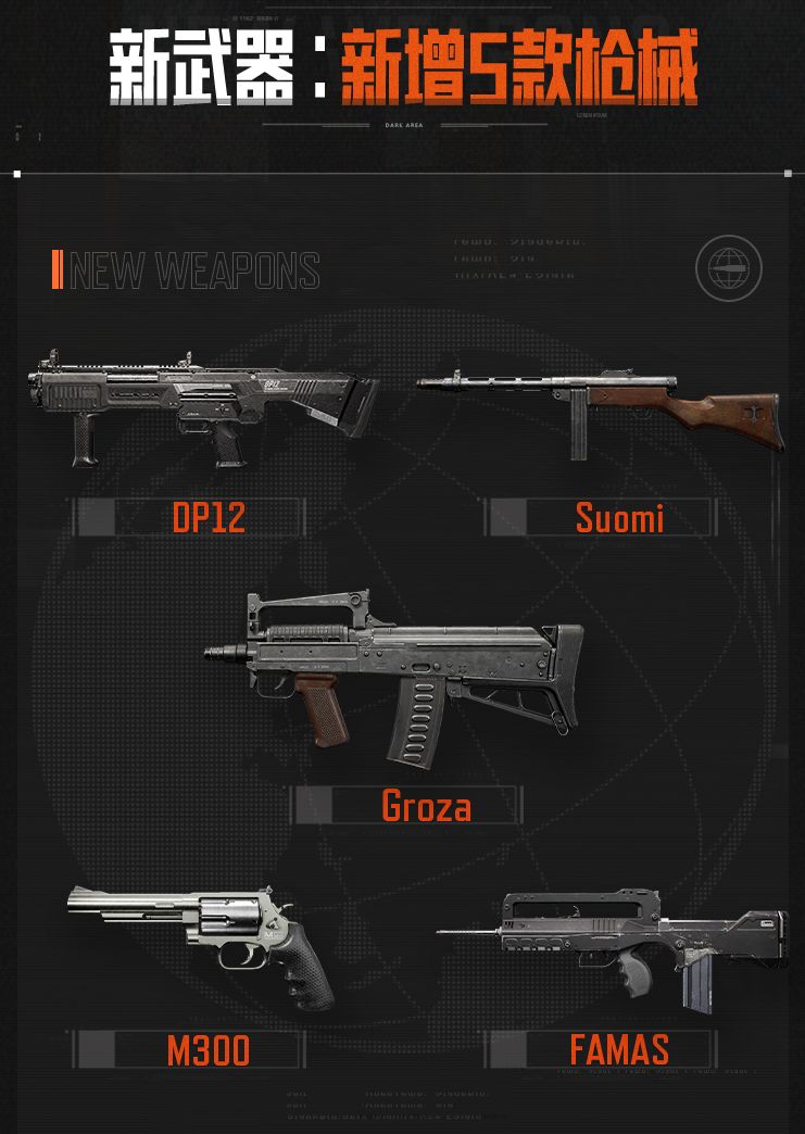 惊喜加码!全新武器“M300转轮手枪”、“Suomi冲锋枪”、“DP12霰弹枪”加入暗区枪械大家庭,更新增势力枪械“FAMAS突击步枪”和“Groza突击步枪”,先锋可以选择势力后在势力商店获取。暗区更首度引入全新战术配件枪盾,可以安装到部分枪械中,为各位先锋对枪增加一份保障!全新战术道具“X300U-A 战术手电”以及全新装备“PM-G型重装弹挂甲”、“RSE重型防爆头盔”、“防卫者M3重装弹挂甲”和“926夜枭胸挂”也将伴随四月版本正式亮相。