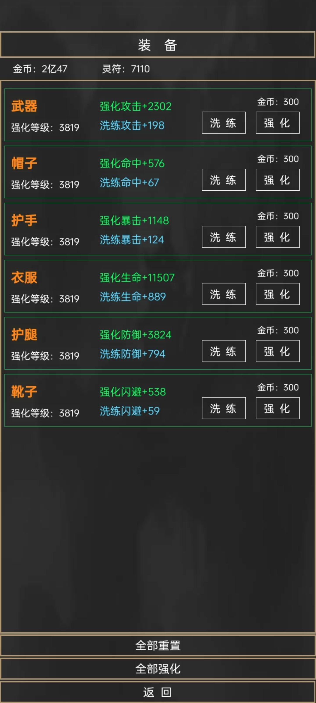 装备洗炼前期灵符不多的时候,建议只用金币刷出一个蓝色品质,后面灵符攒够了可以锁住刷全蓝(反正我是没刷到其他颜色)