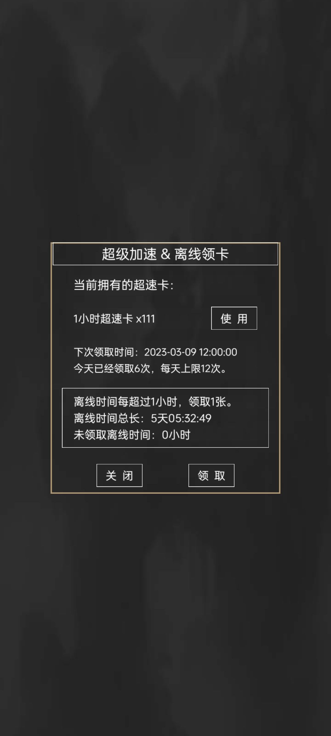 接着又是卡关,直接摆烂,等下一个12点。周而复始ƪ(˘⌣˘)ʃ优雅。(一小时加速卡都懒得用了)