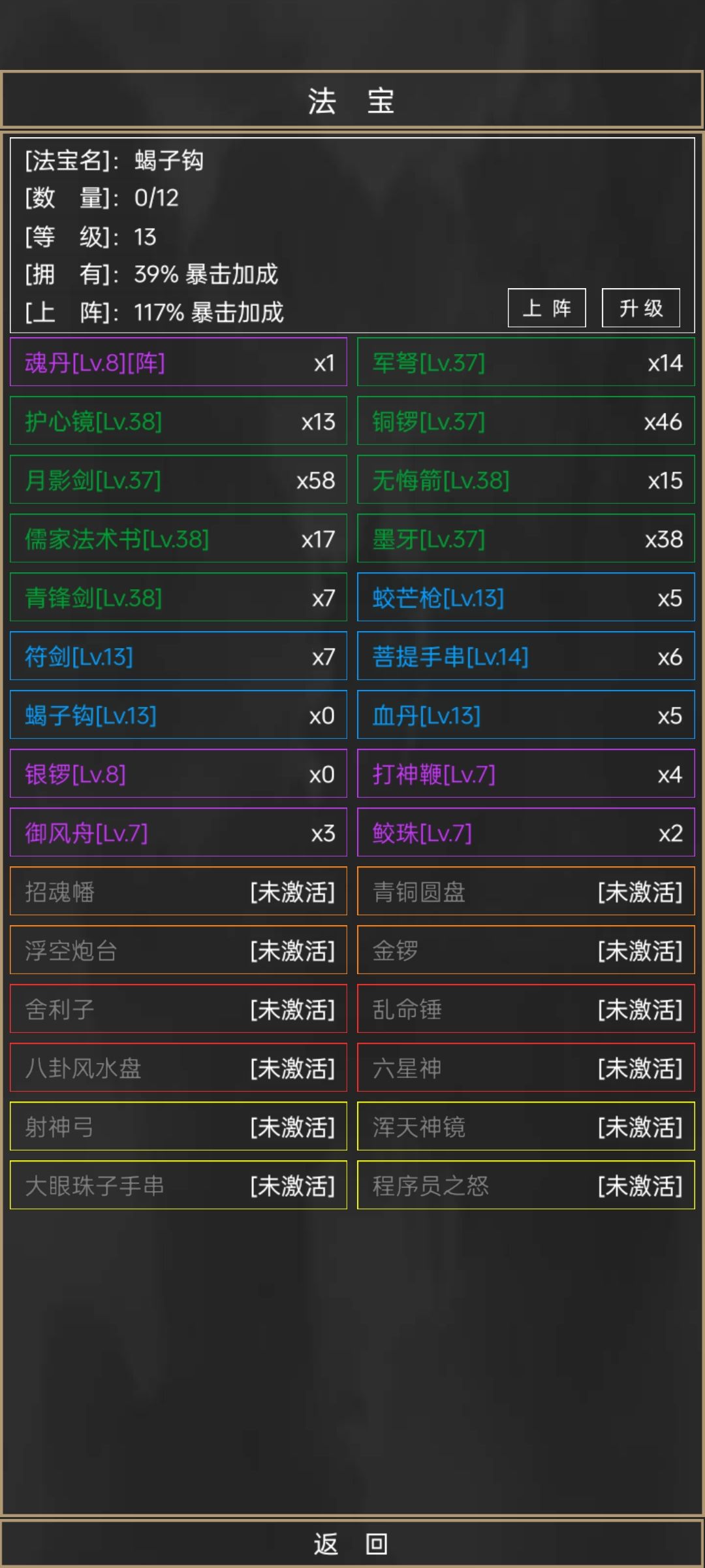 法宝是有了就能获得加成,越多越好。主要提升命中,生命。主要命中很重要。