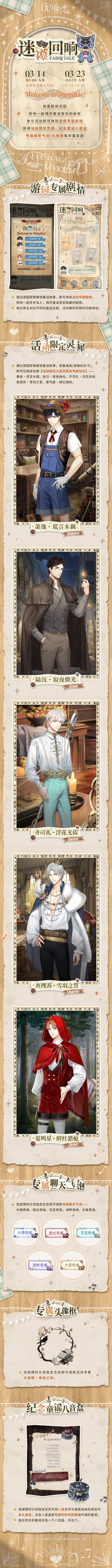 通过游园探索解锁童话故事,即可体验活动专属剧情,和他一起步步深入,揭开童话背后隐藏的秘密。每位男主对应不同的童话主题,活动期间可随时切换体验。