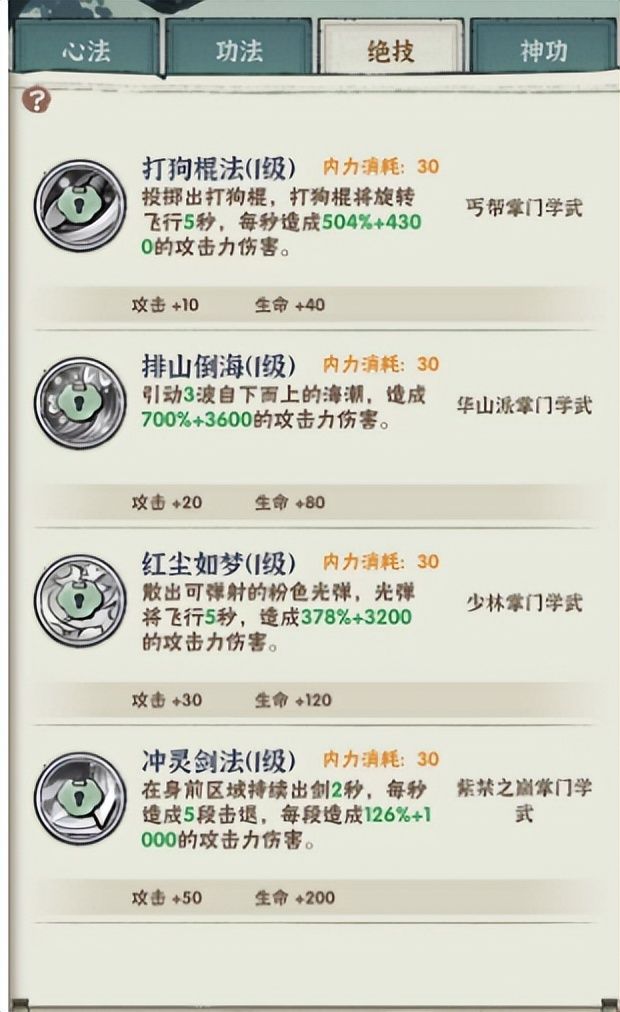 1、武当派:武当派是比较强势的门派了,并且这个门派中的弟子都是比较强势的,玩家们选择武当派以后,是能够学习到武当派的技能和心法武当长春术、武当正气功,武当派的技能也是有非常强力的效果的。