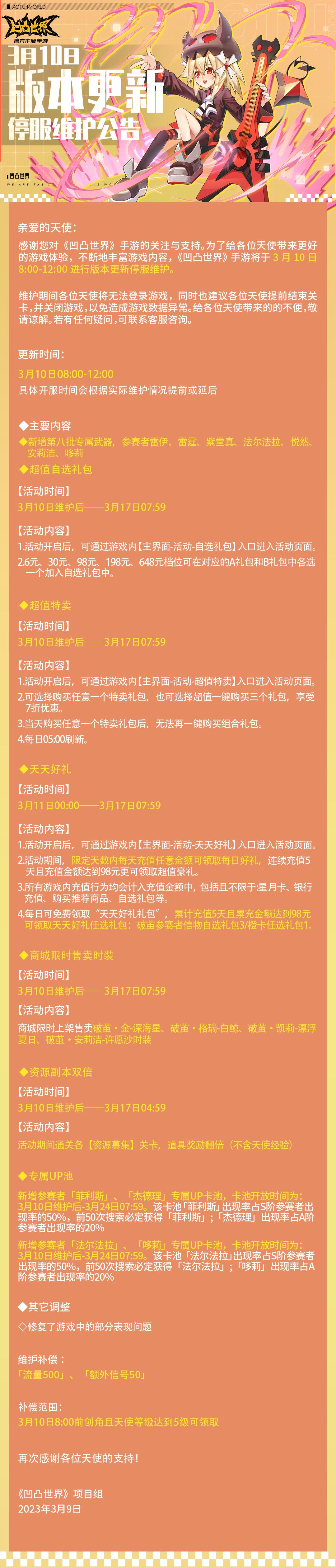 感谢您对《凹凸世界》手游的关注与支持。为了给各位天使带来更好的游戏体验,不断地丰富游戏内容,《凹凸世界》手游将于3月10日8:00-12:00进行版本更新停服维护。
