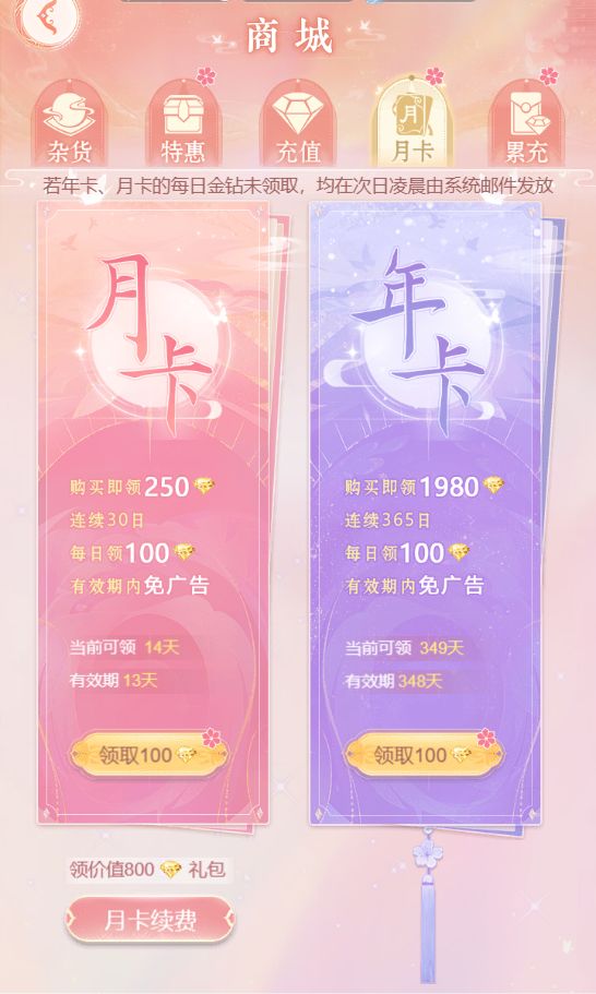 198年卡:购买即领1980金钻,连续365日每日领取100金钻=38480金钻,性价比1943%,在有效期内免广告