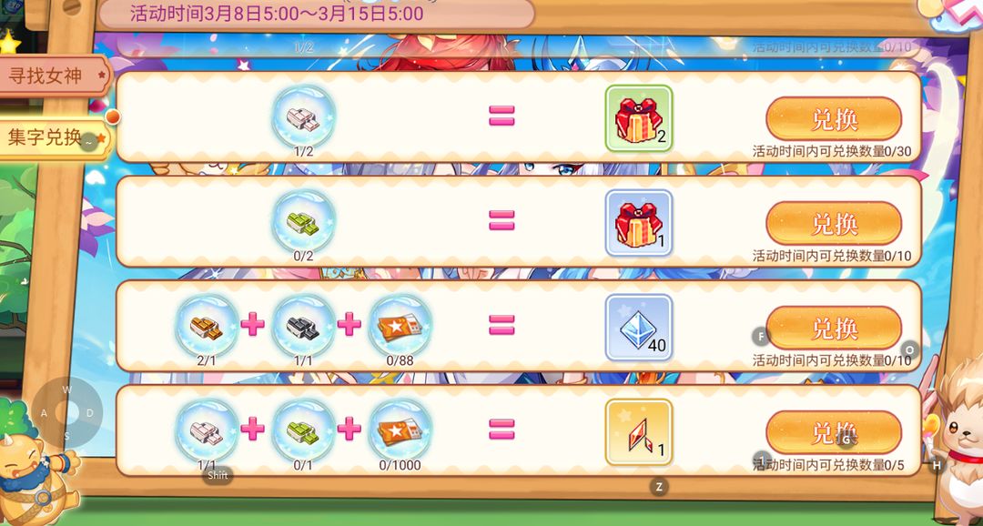 集字兑换活动时间是3月8日 5:00~2023年3月15日5:00,活动期间,玩家可以收集巧克力道具,就可以在女神集字界面进行各种奖励兑换,各位玩家收集到的巧克力注意要在活动时间内进行兑换噢~