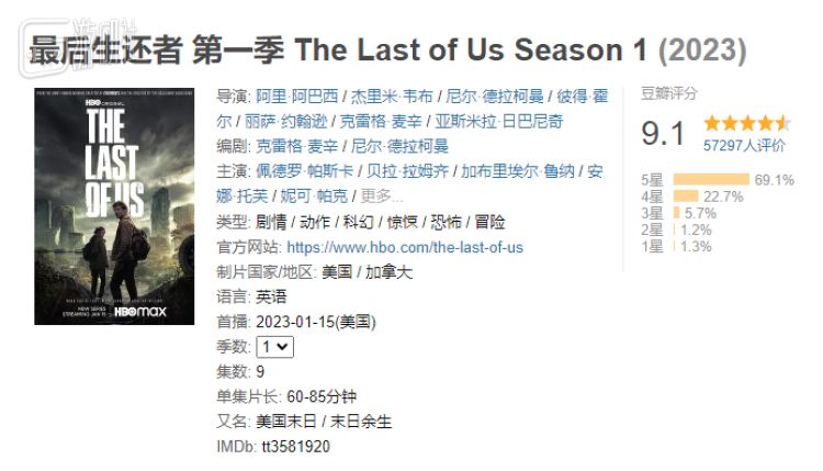 由HBO制作、根据同名游戏改编的剧集《最后生还者》即将迎来大结局,而目前这部剧在豆瓣上的评价依旧维持在9.1的高分。