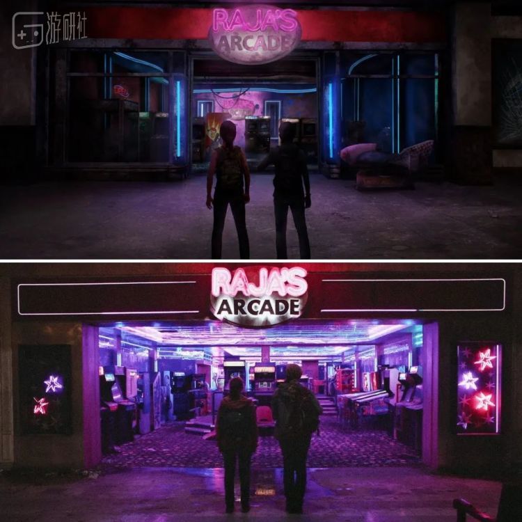 改编作品能够叫好又叫座的实属不多,我们之前也写过专门的文章分析该剧的成功之处,但今天要提的是另一个细节——Raja's Arcade。Raja's Arcade是游戏《最后生还者》DLC里出现过的一个游戏厅场景,在剧情里主角艾莉和莱利偶然发现了这个存在于废弃商场,但却依旧在运转的娱乐设施。这段剧情和场景同样被移植到了真人剧集:在《最后生还者》第七集,主角就来到了这个布景装饰高度还原的游戏厅中。