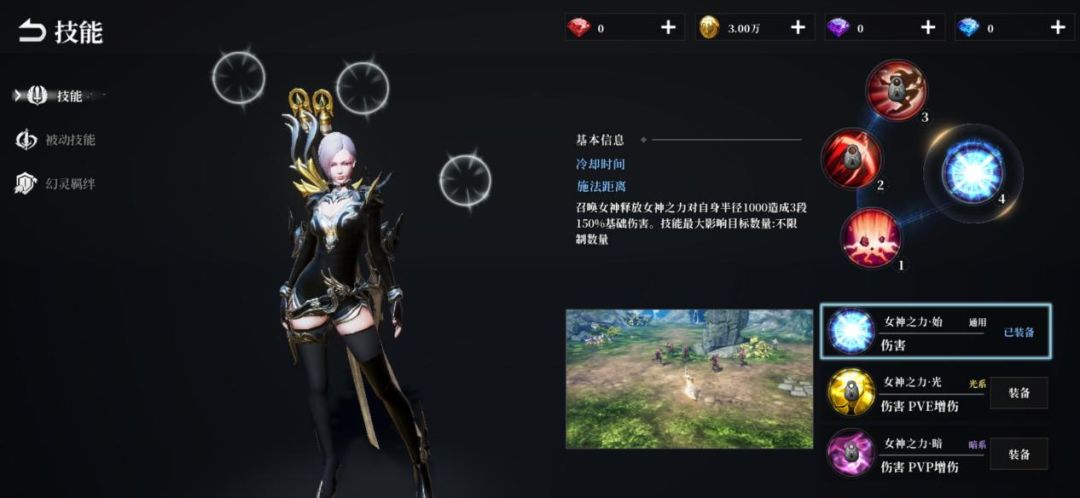 作为女神亲自赐予的核心技,使用该技能后影舞者将直接召唤女神并释放女神之力,来自女神的强大神力会直接对自身半径1000码内的目标造成三段150%的基础伤害,同时这也是唯一一个不限制技能影响目标数量的技能。同时,随着影舞者实力的提升,影舞者将可以召唤强大的光之女神或者暗之女神,两种女神之力将大幅提升影舞者对PVP目标造成的技能伤害,在玩家之间战斗时,该技能的伤害加成将非常客观。