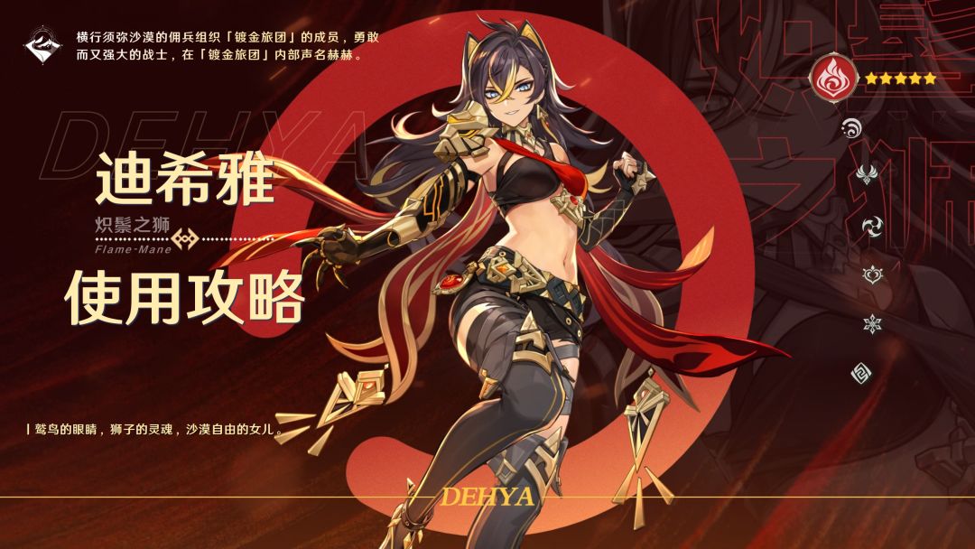 迪希雅,隶属于须弥最强大的武装力量组织[镀金旅团],[炽光猎兽]就是其中一个佣兵团。炽光猎兽佣兵团中,名望最高的便是号称[炽鬃之狮]的迪希雅。