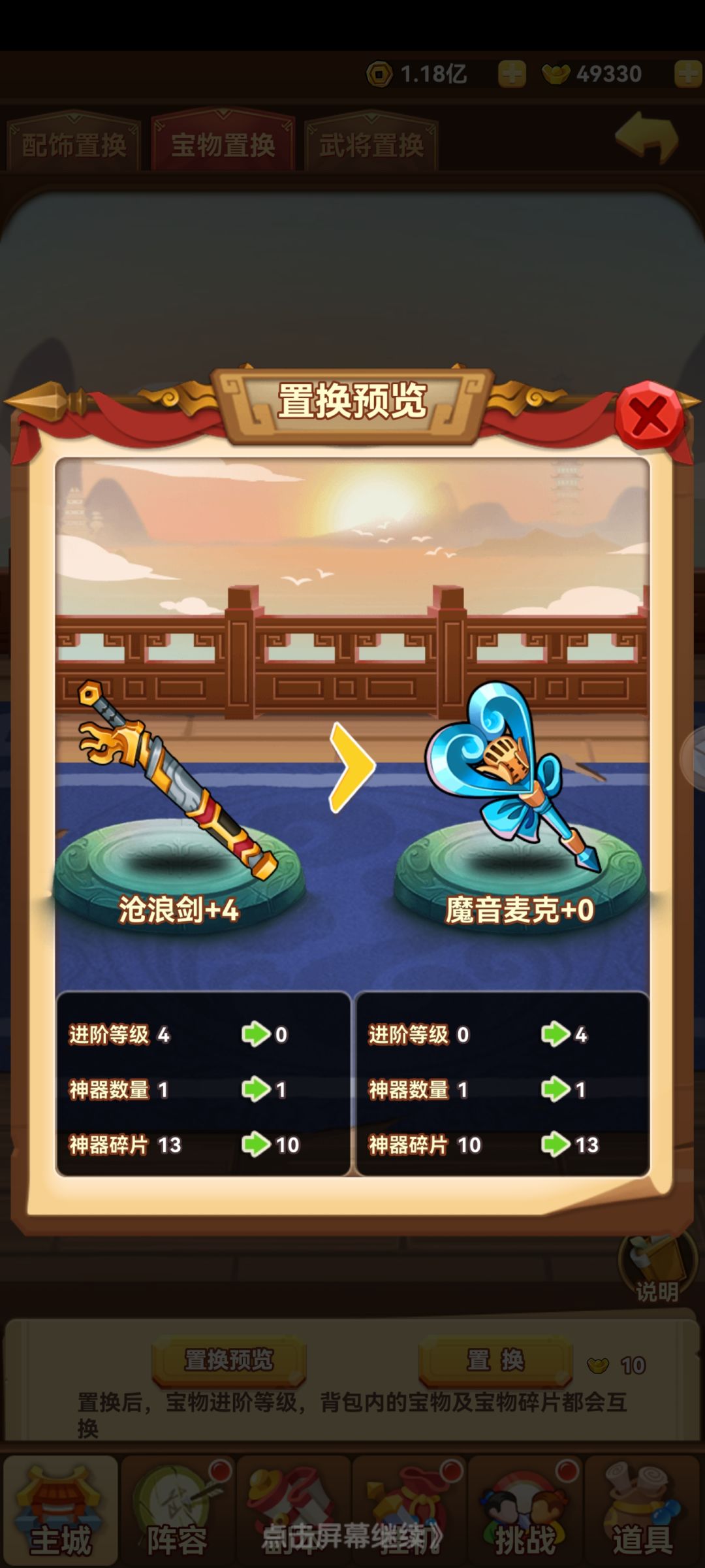同品级的宝物才能置换,即宝箱1内的宝物可以相互置换,宝箱2内的宝物可以相互置换。但宝箱1和宝箱2的宝物不能相互置换。(主角的千炼刀无法置换)