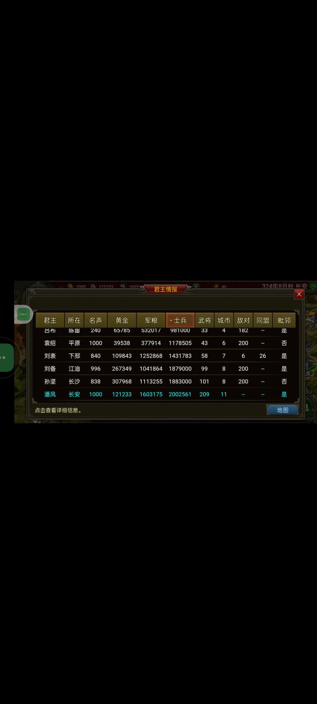 电脑真的是绝了!邢道荣4w兵(光杆)两座城愣是不打他…我和刘表结盟了往东边绕势力太多了,麻烦…所以往西走,还被吕布和公孙度偷了家…然后我每个城放了一个两个智将带圆阵长安又留了四五个智将就没有掉城了!这个本也接近尾声了!