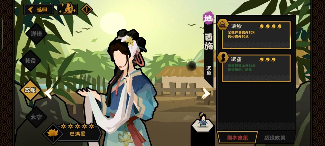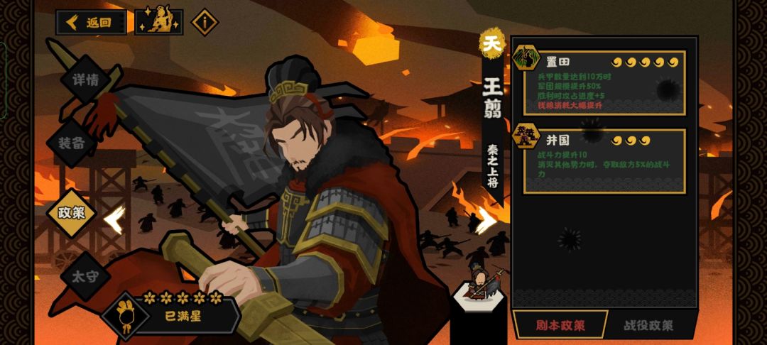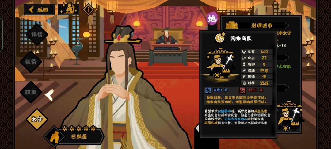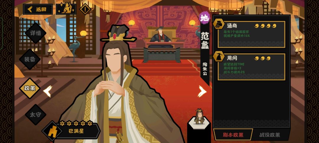 总之范蠡的核心技是通商,联盟国家越多,技能所能提供的钱粮产粮就越多。一般开局结盟二至三个国家钱粮就够用了(记得结盟较远,与你不接壤的国家,以防他破盟过来打你)前期靠盟友提升大量钱粮产量,等后期想对盟友动刀子时,已经不需用太高额外的钱粮产量吧?毕竟你都想打盟友了,肯定快一统全国了,城池之多,政策之全,已无需通商。