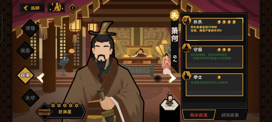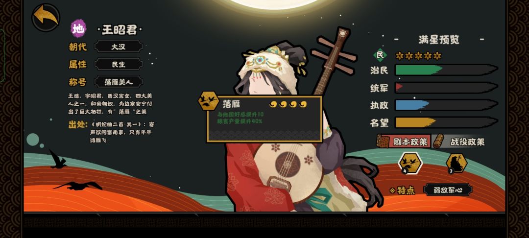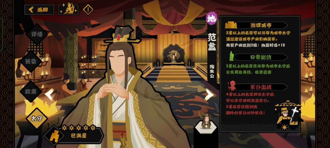总结,范蠡能在前中期提供大量的钱粮产量,十分优秀,但二技能缺少特色(毕竟我拿来跟他对比的民生名臣除了提供钱粮产量技能外,其他技能都富有特色,这也是那些名臣的强度所在。),建议搭配其他用间名臣使用。