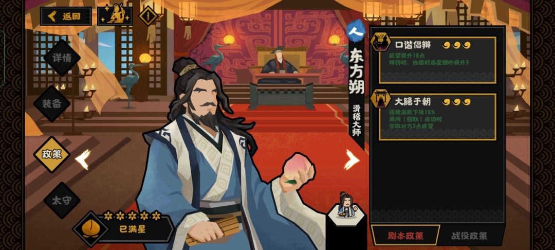 通过口谐倡辩,快速提高他国好感,同时加快用间技能的触发,再利用大隐于市,加快钱粮与威望获取速度,走结盟会盟流。