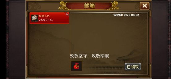 活动期间登录游戏,即可获得【红星礼包】一份,内含【元宝 *281,攻击果 *1,防御果 *1,爆击果 *1,士气果 *1,精神果 *1,金钱 *666】,助各位主公扬士气展英豪。