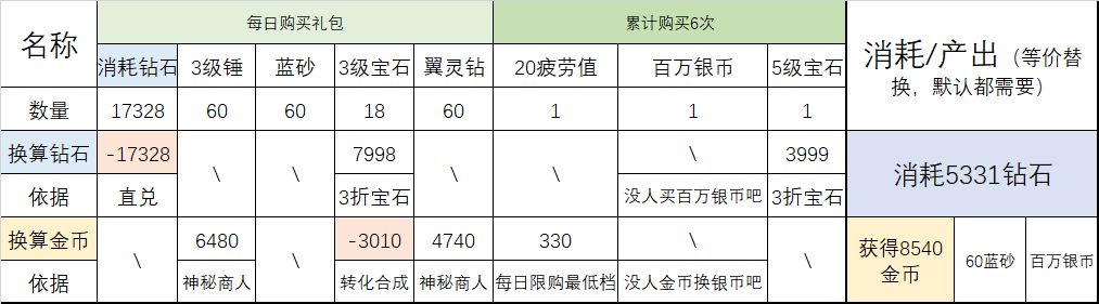 2.这次活动相当于,消耗5331钻石,获得8540金币、60蓝沙、百万银币。