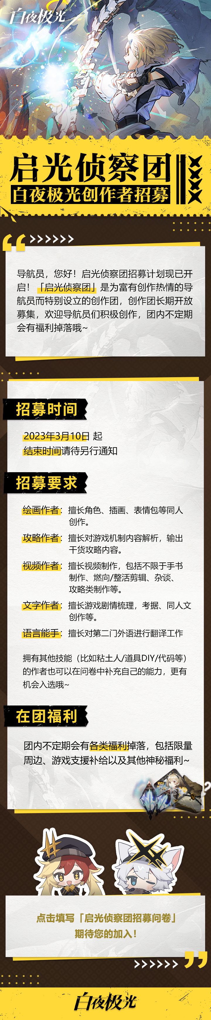 「启光侦察团」是为《白夜极光》富有创作热情的导航员而特别设立的创作团,创作团长期开放募集,欢迎导航员们积极创作,团内不定期会有福利掉落哦~