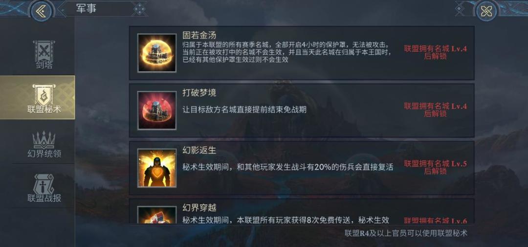 联盟占领四到六级名城后可解锁不同的联盟秘术,每个秘术都有不同的效果,只要合理利用可以让联盟在赛季中事半功倍!