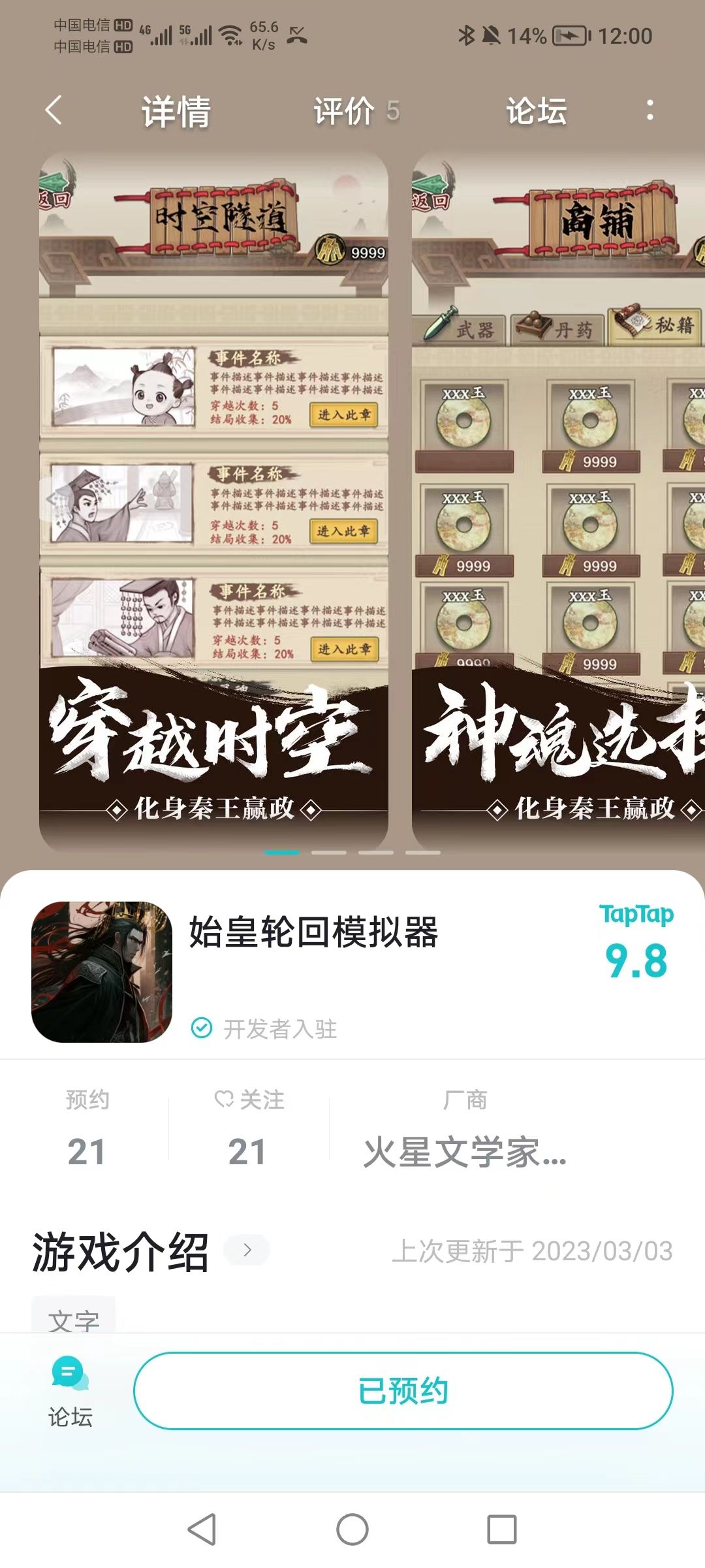 预约《始皇轮回模拟器》,并在该帖内发送预约成功的截图,如:以下示例