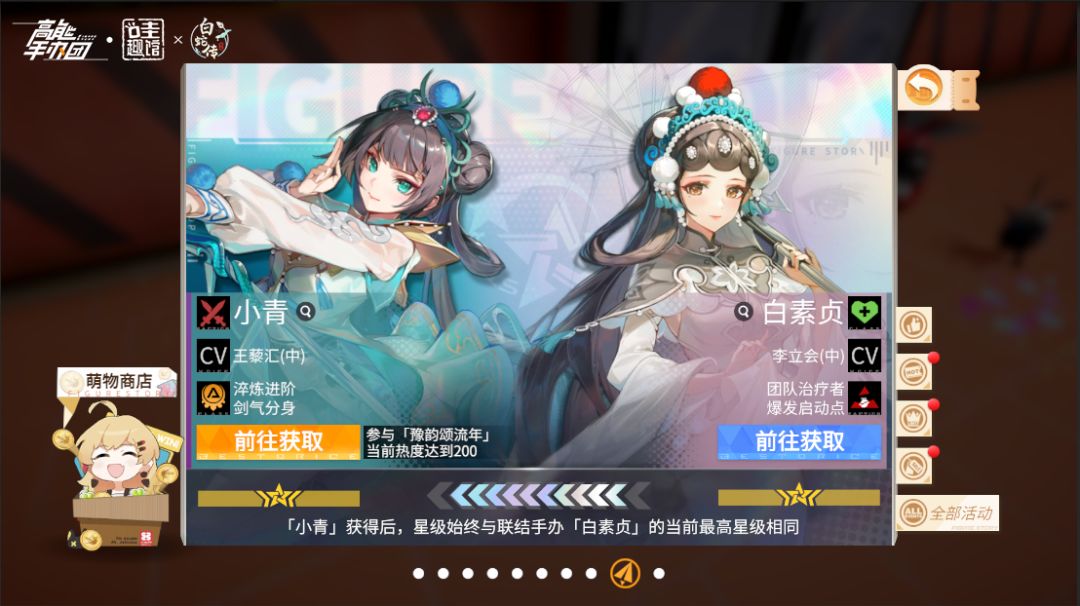 “国潮曲韵·伊人如梦”——特殊星缘手办“小青·碧海情天 Ver.” 到来,收藏家们可以通过联动活动“豫韵颂流年”为热爱戏曲的手办演员捧场,提升至相应热度即可获取联动手办“小青”,获取后无需对其进行升星操作,其星级将与已拥有的“白素贞”当前最高星级绑定:最高星级的白素贞星级提升时,“小青”星级将会自动提升;最高星级的白素贞回退时,小青的星级也将同步变化。