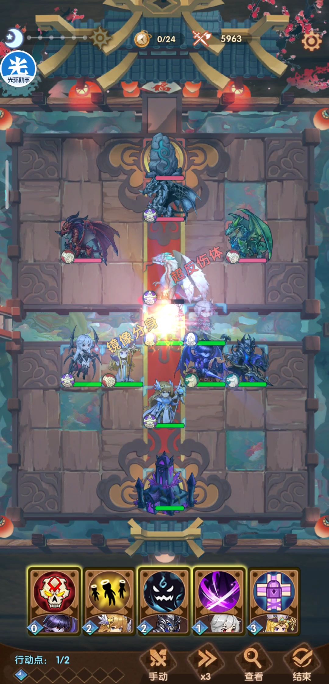 如视频所示站位(纳尼?没有视频?这就对了,手机传半天传不了视频,先上个图凑数吧,等过两天有电脑了再补回来),开始几回合的路线比较固定,6回合要复活一波,8回合复活第二波,8回合的时候可以开始揍龙了,这个时候献祭要用在幸运女神身上,她血厚难死,得炸掉,其他复活起来的人,火龙和黑龙直接清屏。