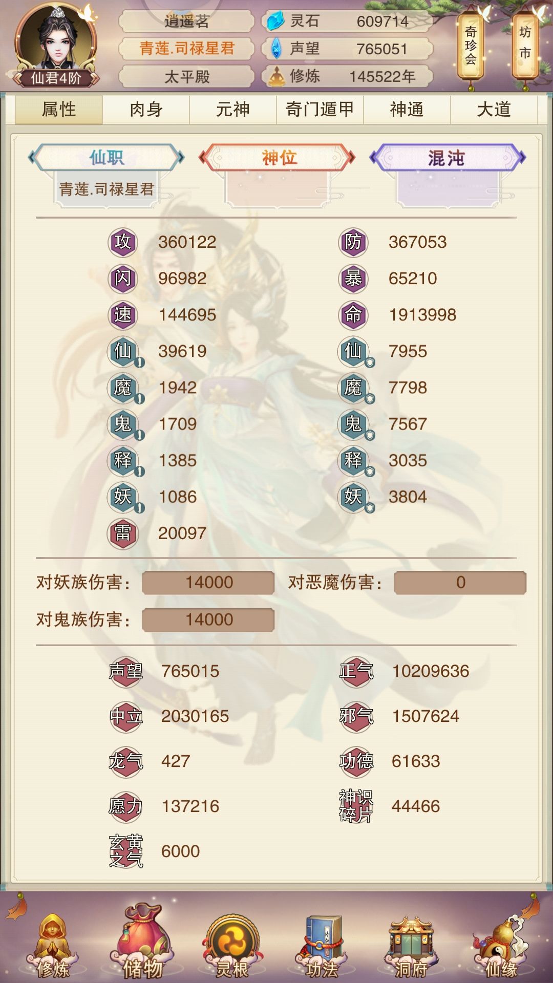 从进去神界之后就没有好好玩,现在想好好玩一下,目前战斗力36w,防御力36w,命190w,丹药磕到六品,六品以上吃过部分,原神太古境界九重,灵魂强度太古境十重,神识93基本都是一级,六品仙器,丹师,玄武四品衣,聚灵297,仙兽三代火鸦,界主打不过去,高级宠物没。