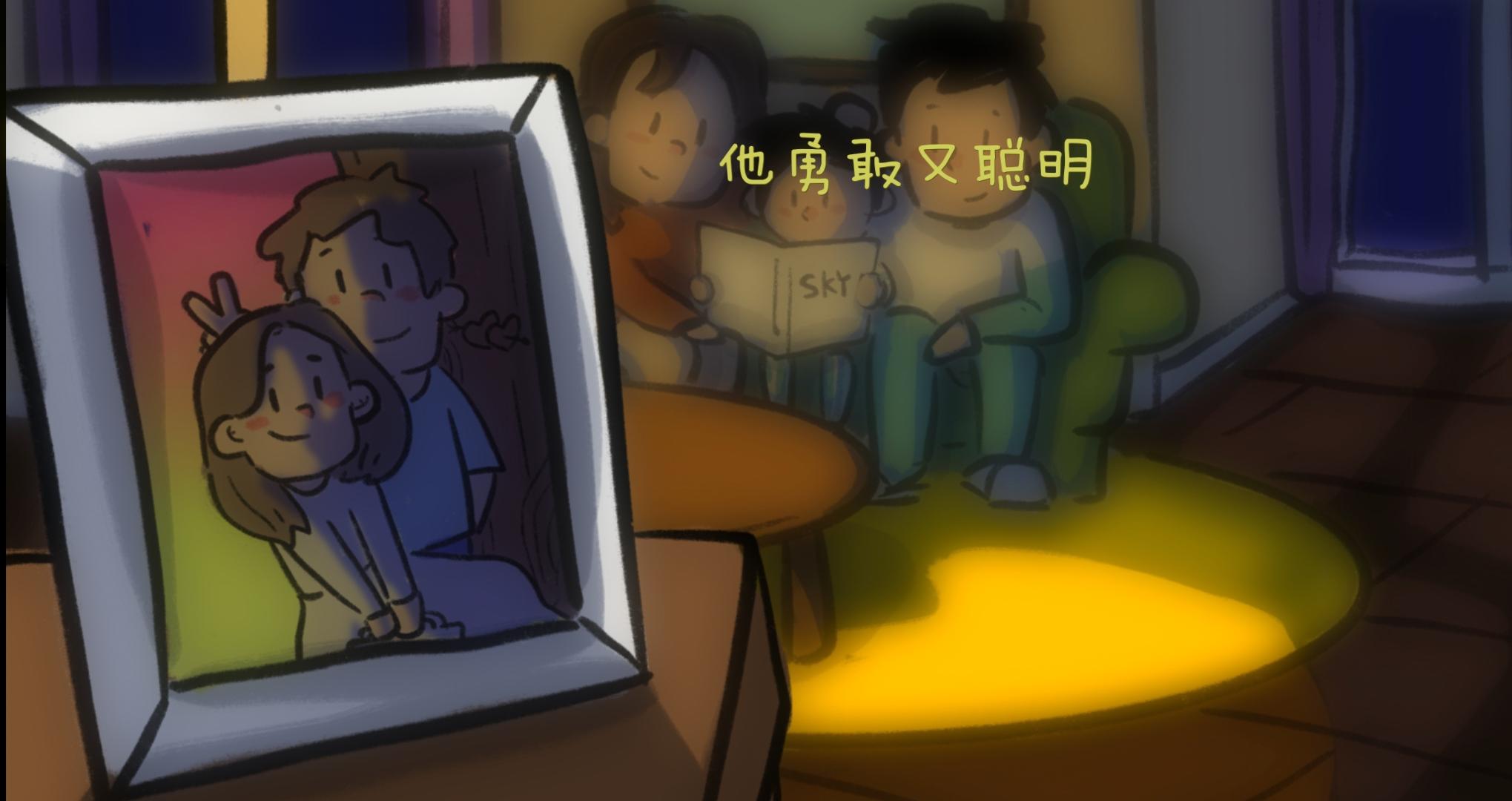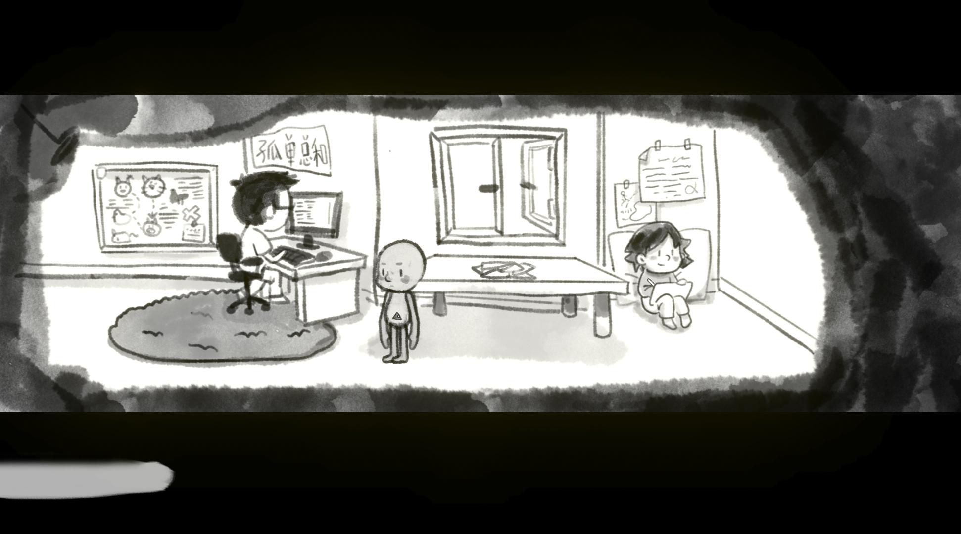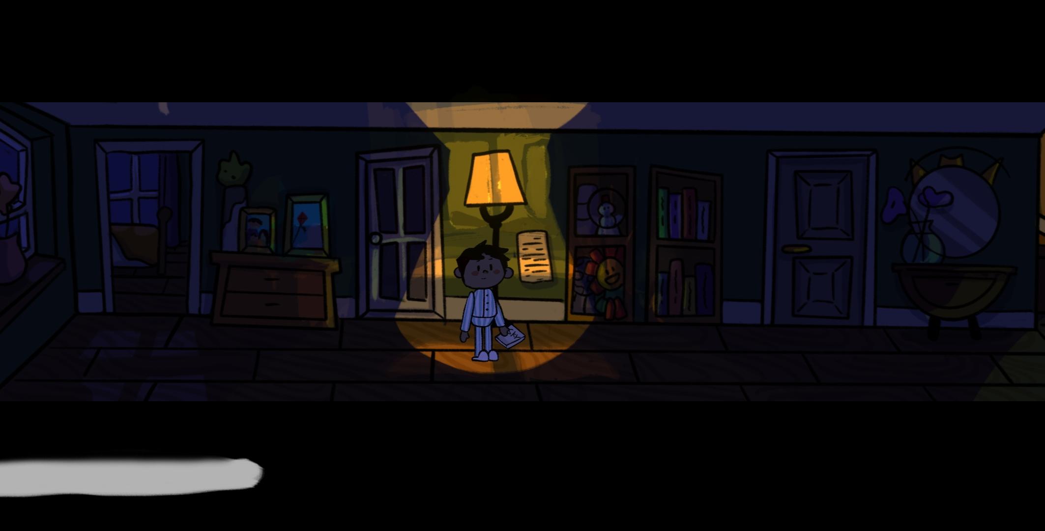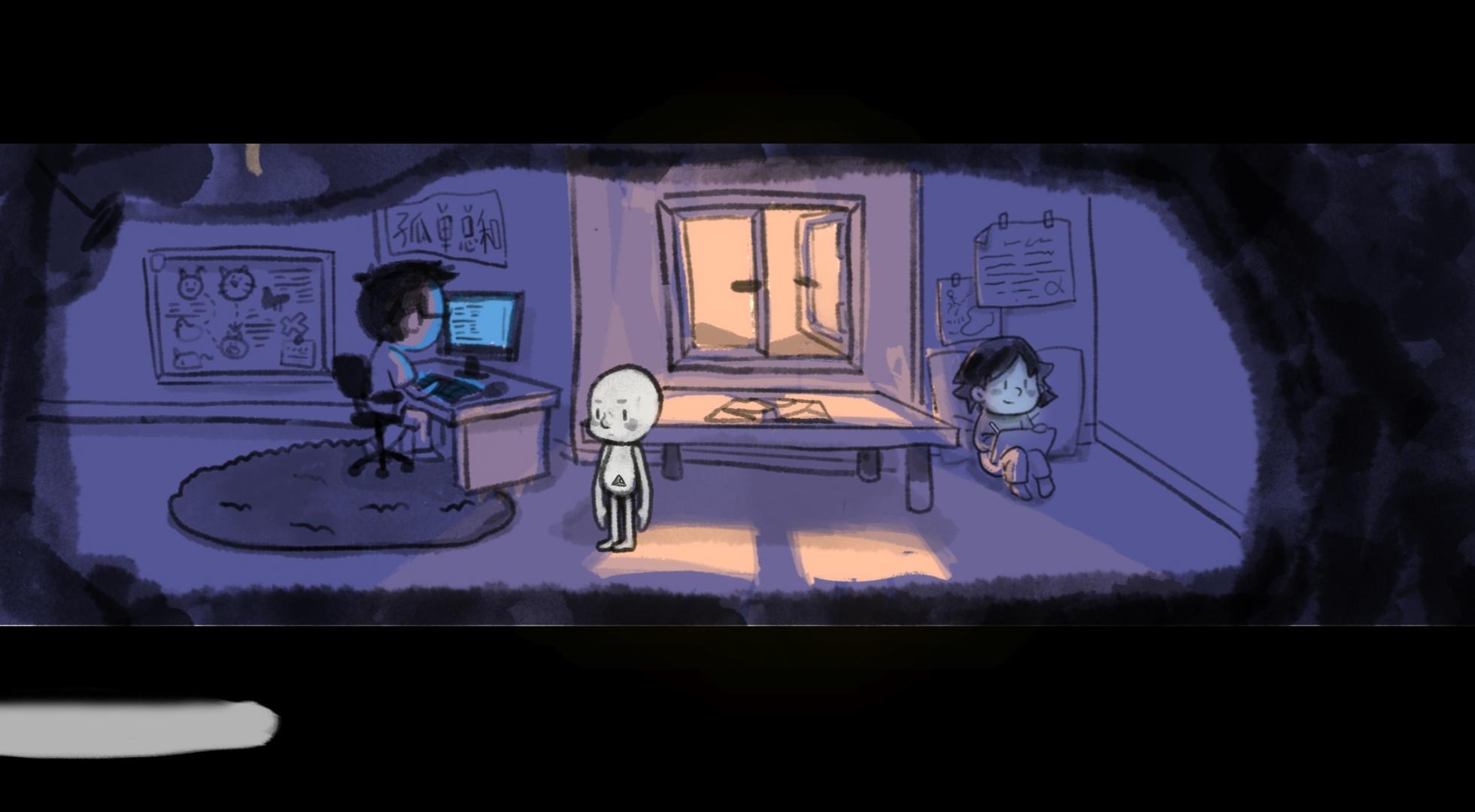 游戏一开始出现的红色对话框应该是父母争吵的内容,作为主人公的小男孩显然是被吓到了,躲在被窝里哭(好真实的场景)