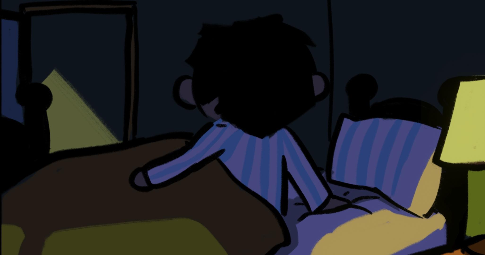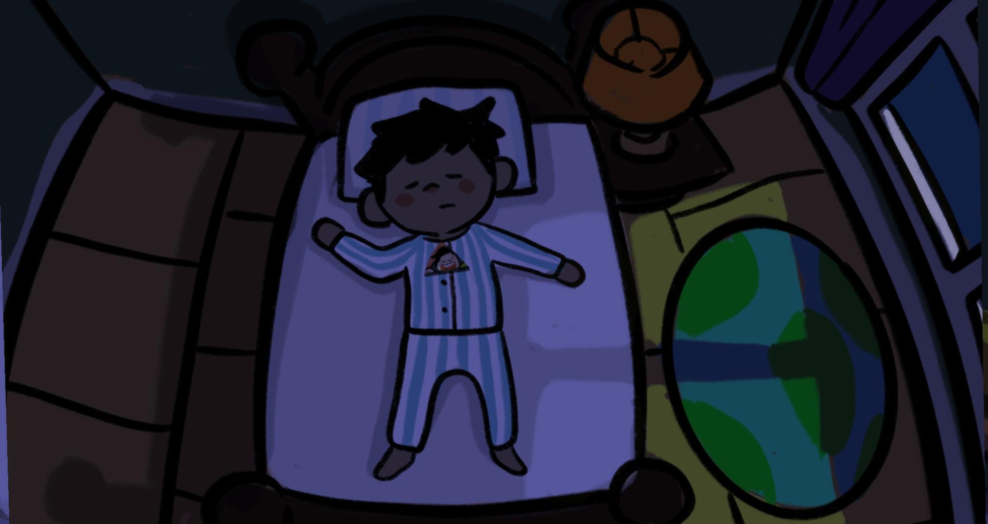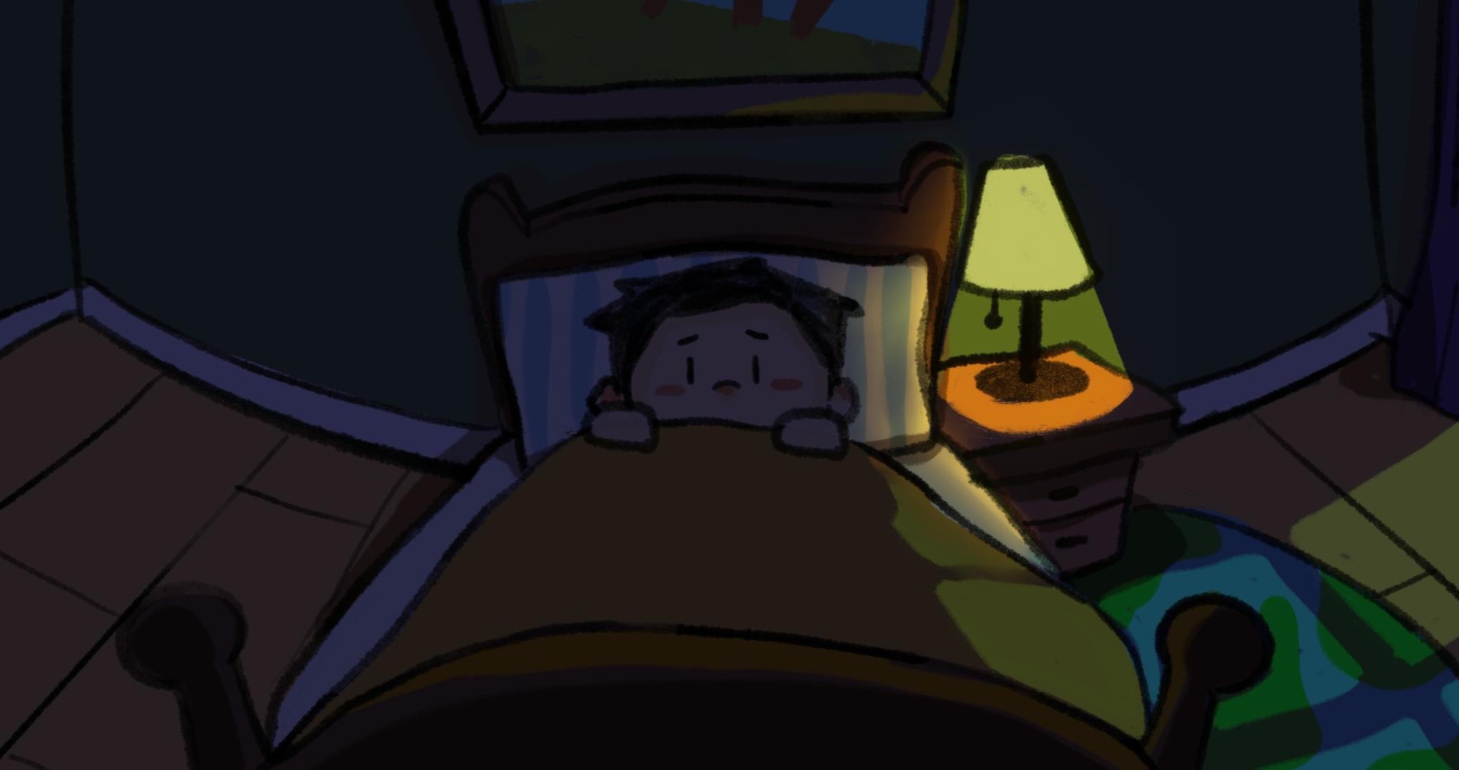 游戏一开始出现的红色对话框应该是父母争吵的内容,作为主人公的小男孩显然是被吓到了,躲在被窝里哭(好真实的场景)
