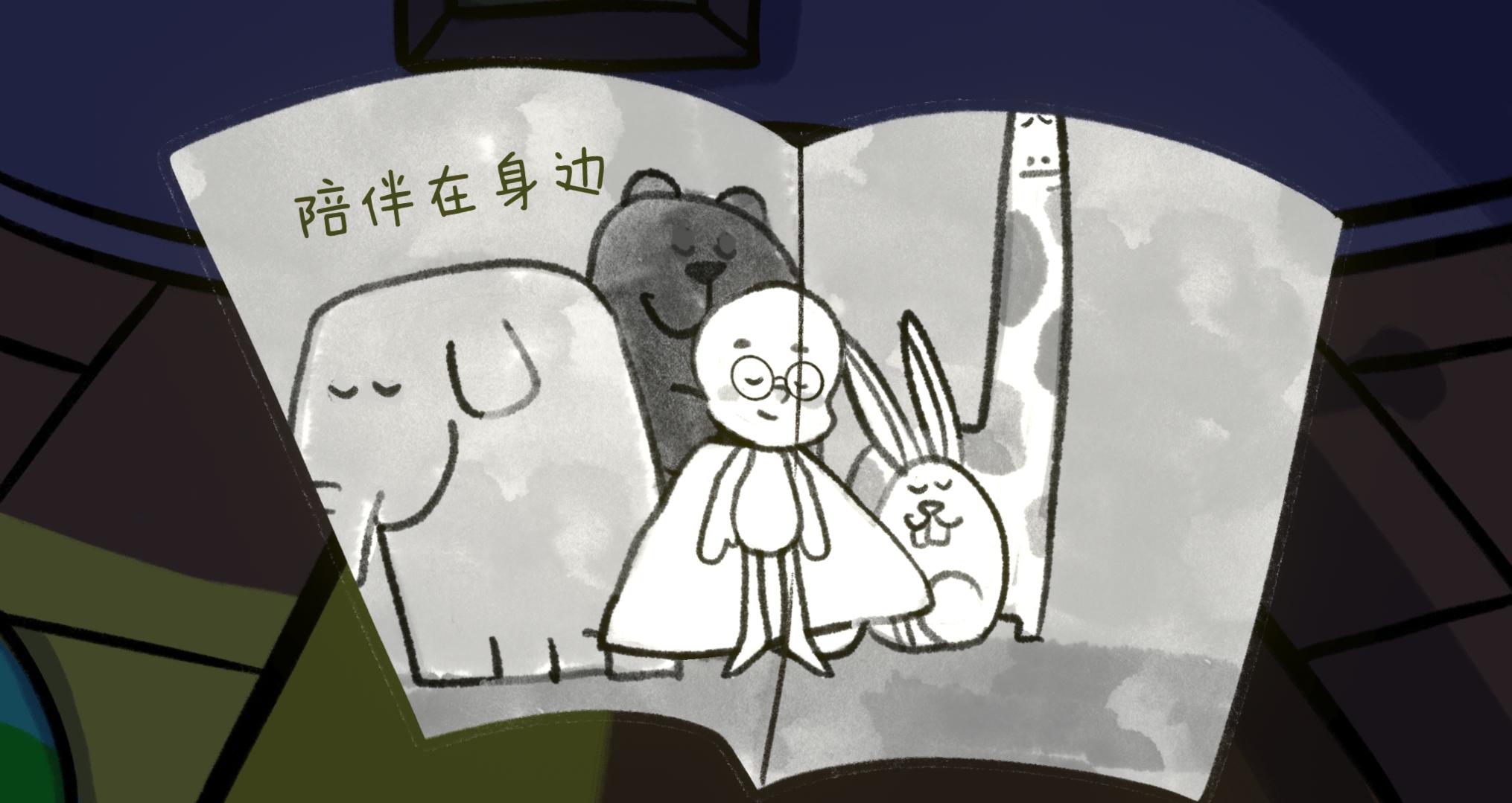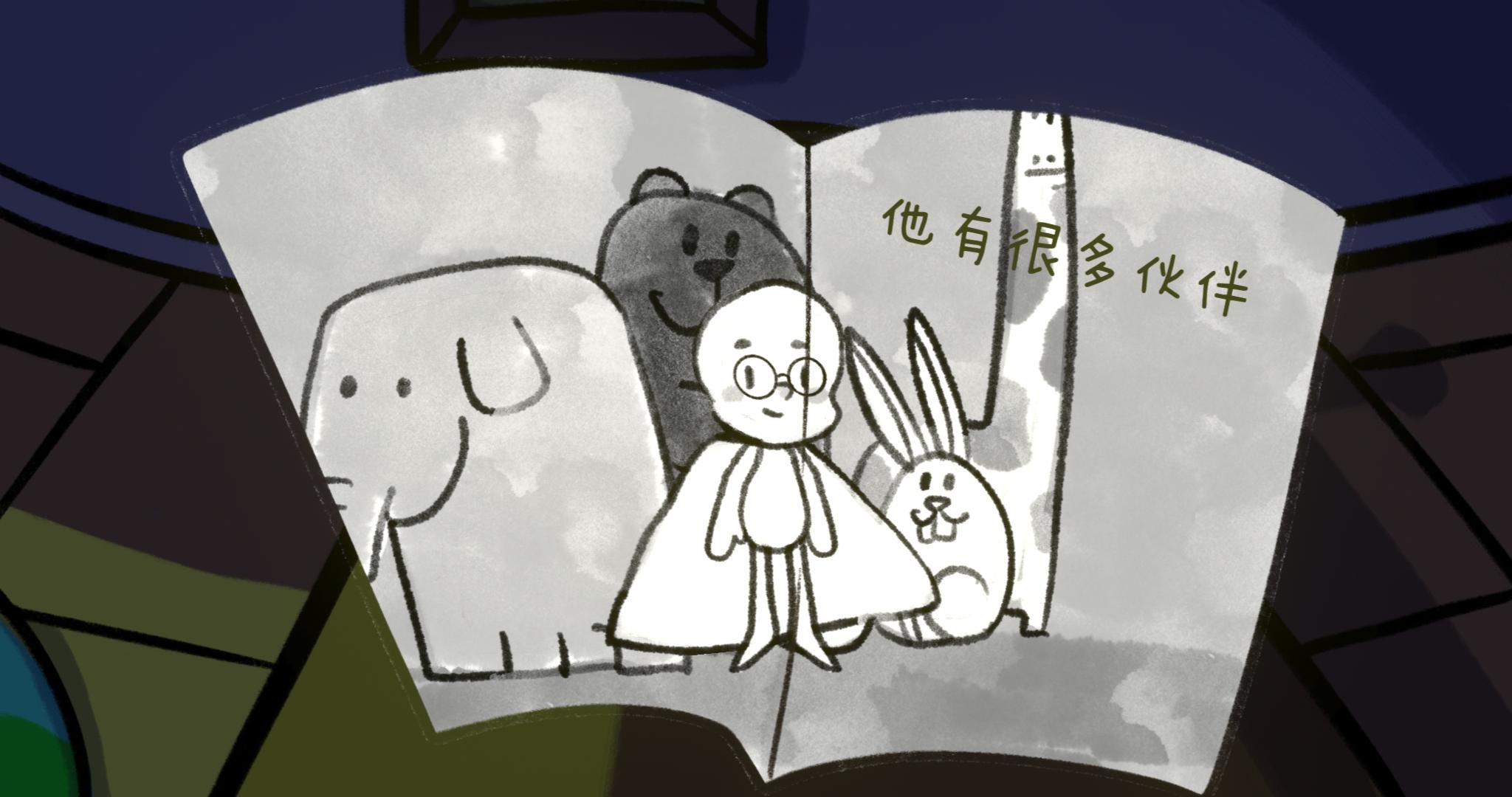 (无端联想:是不是小男孩生病了不能经常出去玩,所以他的朋友们都是小动物,甚至是动物玩偶,孤独有可能导致他更加敏感)