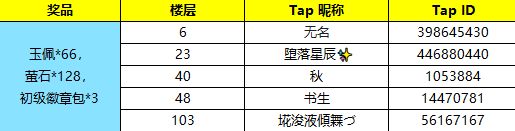 随机抽取五人获得玉佩*66、萤石*128、初级徽章包*3
