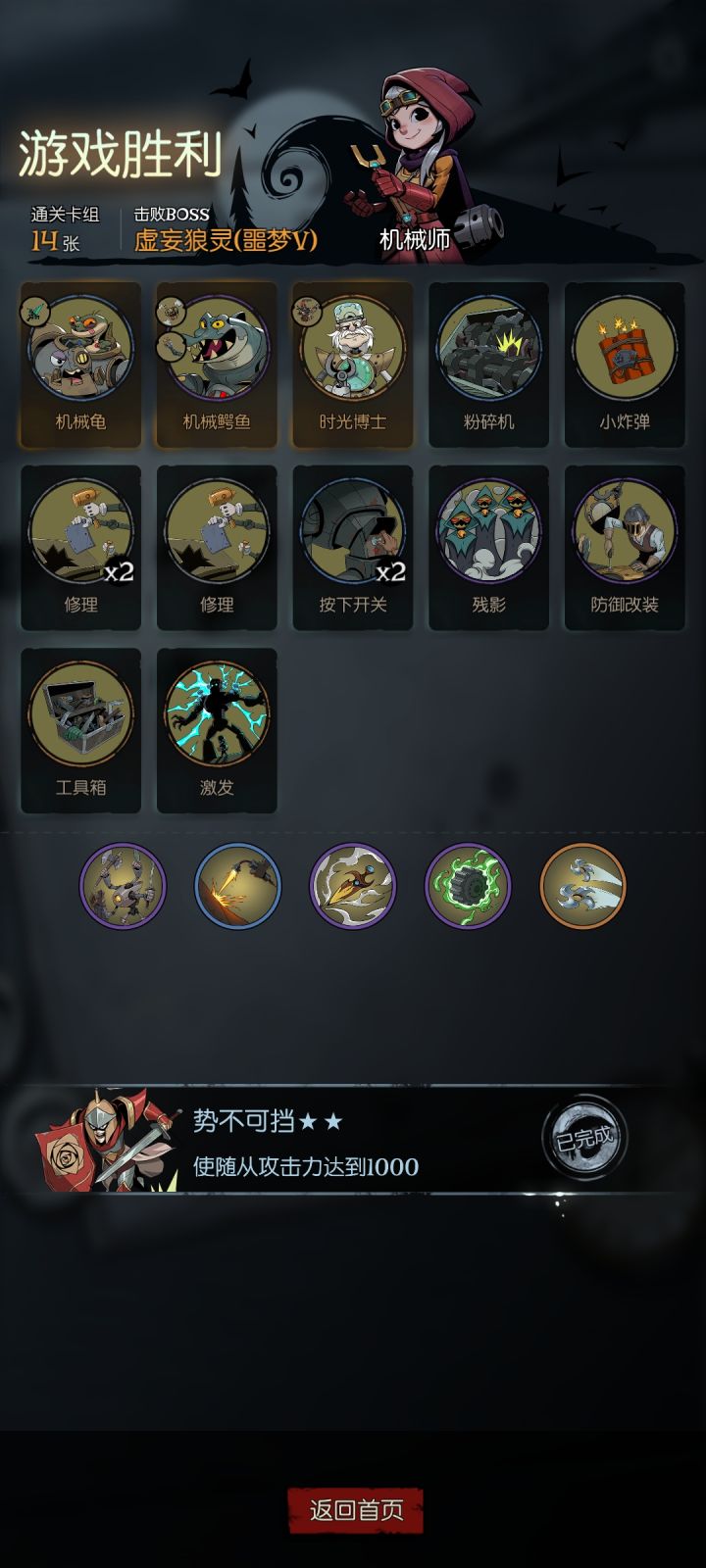 思路:随从附着给鳄鱼大哥触发装备效果抽牌,抽牌抽出0费行动牌(工具箱,修理)或残影增加行动力,行动力再用来附着鳄鱼,实现无限刷充能。