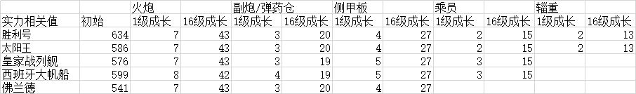 5、各部件升级的实力成长量与航海币消耗正相关,顺序为:火炮>侧甲板>副炮/弹药仓>乘员=辎重。过图时建议按此顺序升级以获取极限炮击伤害。下海时可调整为均匀升级或优先乘员舱-辎重舱-侧甲板,舰队实力变化不大且有效提高水手数(舰队血量)。具体成长值参考见下表。