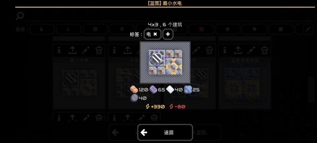 优点是体积小,可在任意浅水面铺设,向任意方向扩展。缺点是有大面积浅水域的地图很小,一般很难铺满8联;而且第一张水电配比很极限,发电不稳,又体积过小,没法内设电池和节点(你也可以在下面自己加电池),不是很实用。3个水电蓝图在16联之后发电已经过3k,已经足够满足前期地图的使用。(当然一般8联就够了,毕竟发电主要还是靠冲反和钍堆)。