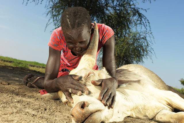——妇女抱着她因吃了死水里有毒的草后中毒而垂死的牛哭泣。