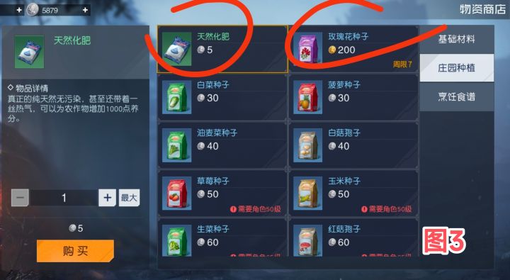 3.(图三)物资商店里会售卖粮食作物种子和化肥;经济作物:玫瑰种子虽然很贵,要用金币购买,但是用途很大(独狼没用),送给其他玩家增加亲密度。