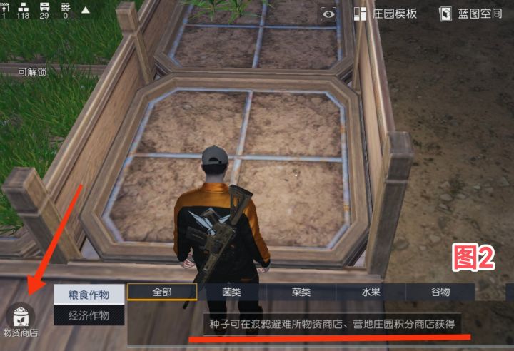 2.(图二)使用银币开荒土地后,点击中间的种植按钮,可以查看剩余的种子,如果没有可以点击物资商店,前往兑换。