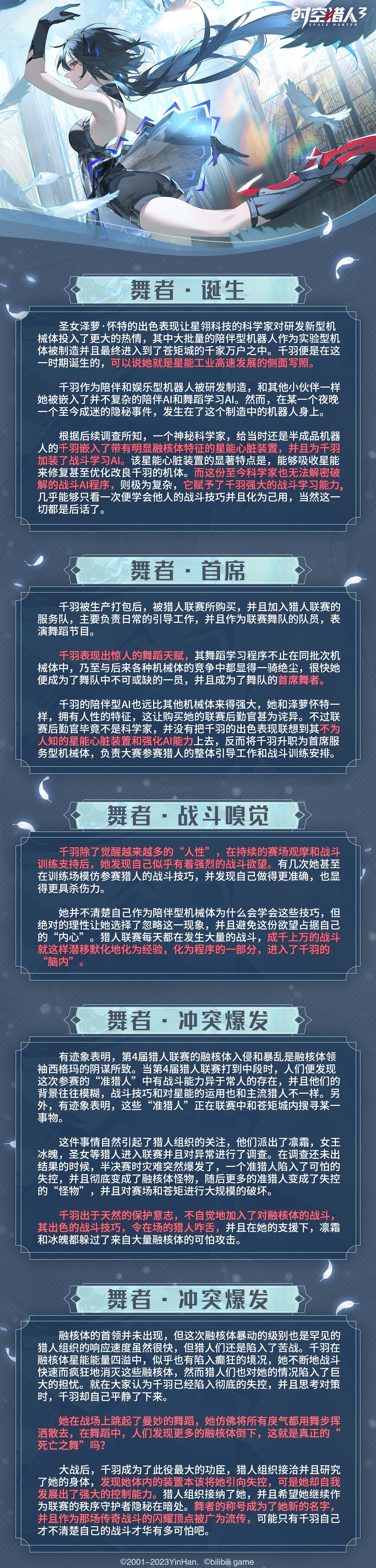 「舞者·千羽」原为科学家模仿猎人「泽萝·怀特」制造的陪伴/服务型机器人,却因为不明的原因,在身体内嵌入了战斗芯片。在猎人联赛担当侍应和舞蹈演员期间,千羽无意间摄入了大量的战斗知识,战斗AI超乎想象地进化,让她成长为可怕的战斗机器,并且在一次猎人联赛的暴乱中得到了施展。星翎科技关注到了这个神奇的机械体,并且将她带入了组织。