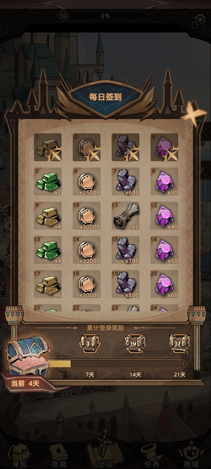 可以看出我的签到是第4天,但是,真正的游戏时间大概也就2天,第一天签了个道,玩了一会。图上的游戏进度在昨天已经完成,今天也只是签了个道。